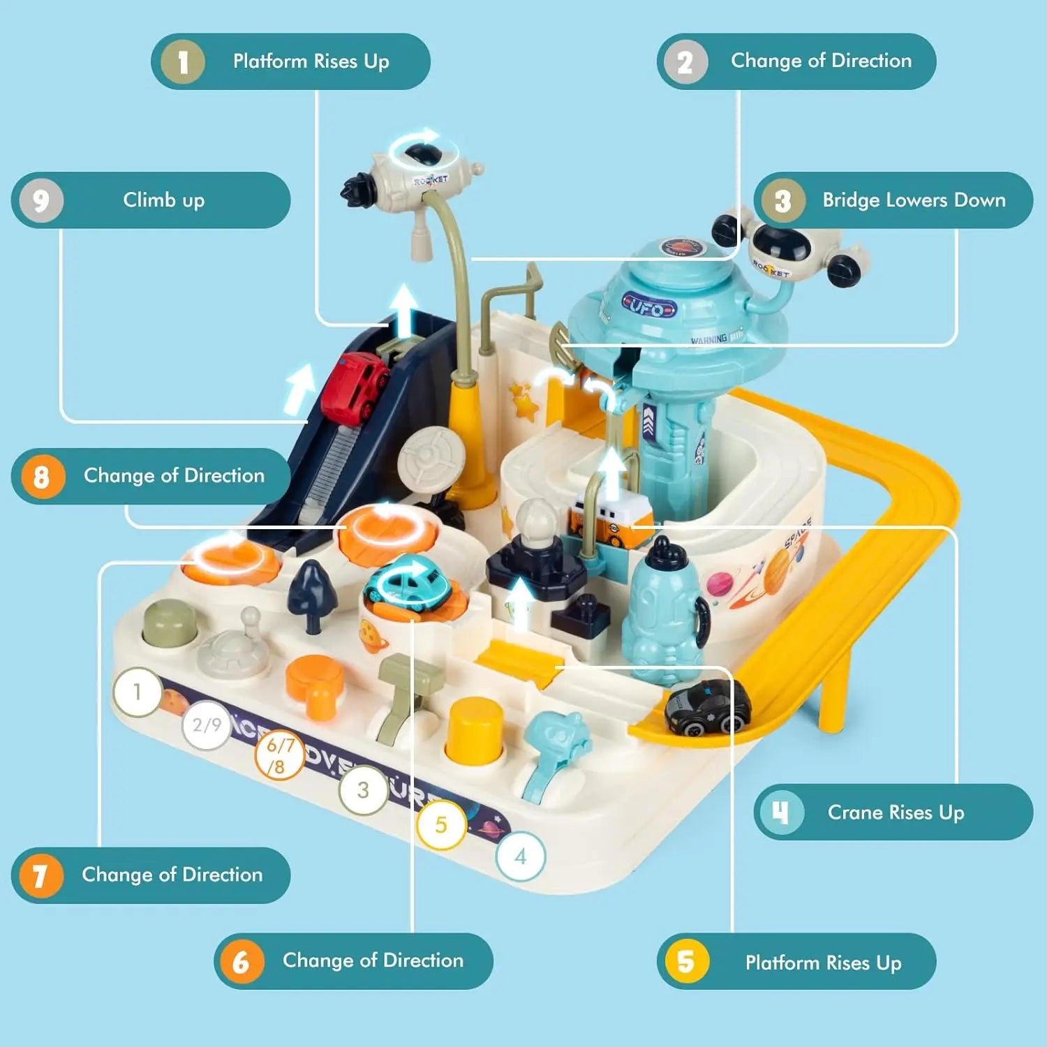 Ultimate Car Adventures Toy Set: This eye-catching car adventures toy comes with 4 exciting vehicles, ready to zoom through 8 thrilling challenges and 6 interactive buttons that keep your little racers engaged and entertained!
