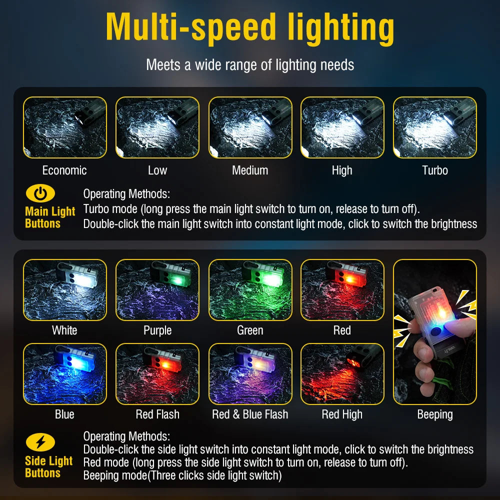 - 13 Lighting Modes -The small keychain flashlight has 6 modes for the main light (super bright - high light - medium bright - low light- economic- red light), 7 modes of side light (white light - purple light - green light - blue light - red flash - red & blue flash),which can meet your different requirements. Our tiny flashlight is bright enough and can meet the needs of daily use even in low-light mode.